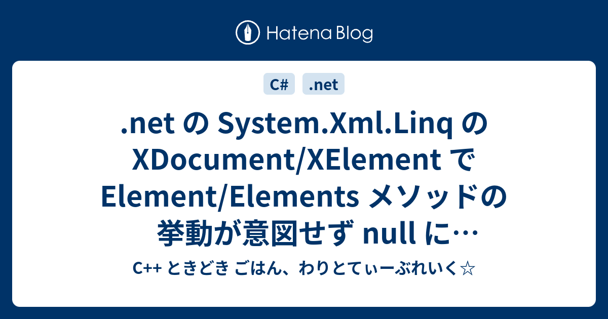 Net の System Xml Linq の Xdocument Xelement で Element Elements メソッドの挙動が意図せず Null になったり空になったり あるいはそもそも名前空間を与えたつもりの実装で例外が飛んだりした時に思い出すため のメモ C ときどき ごはん わりとてぃーぶれいく